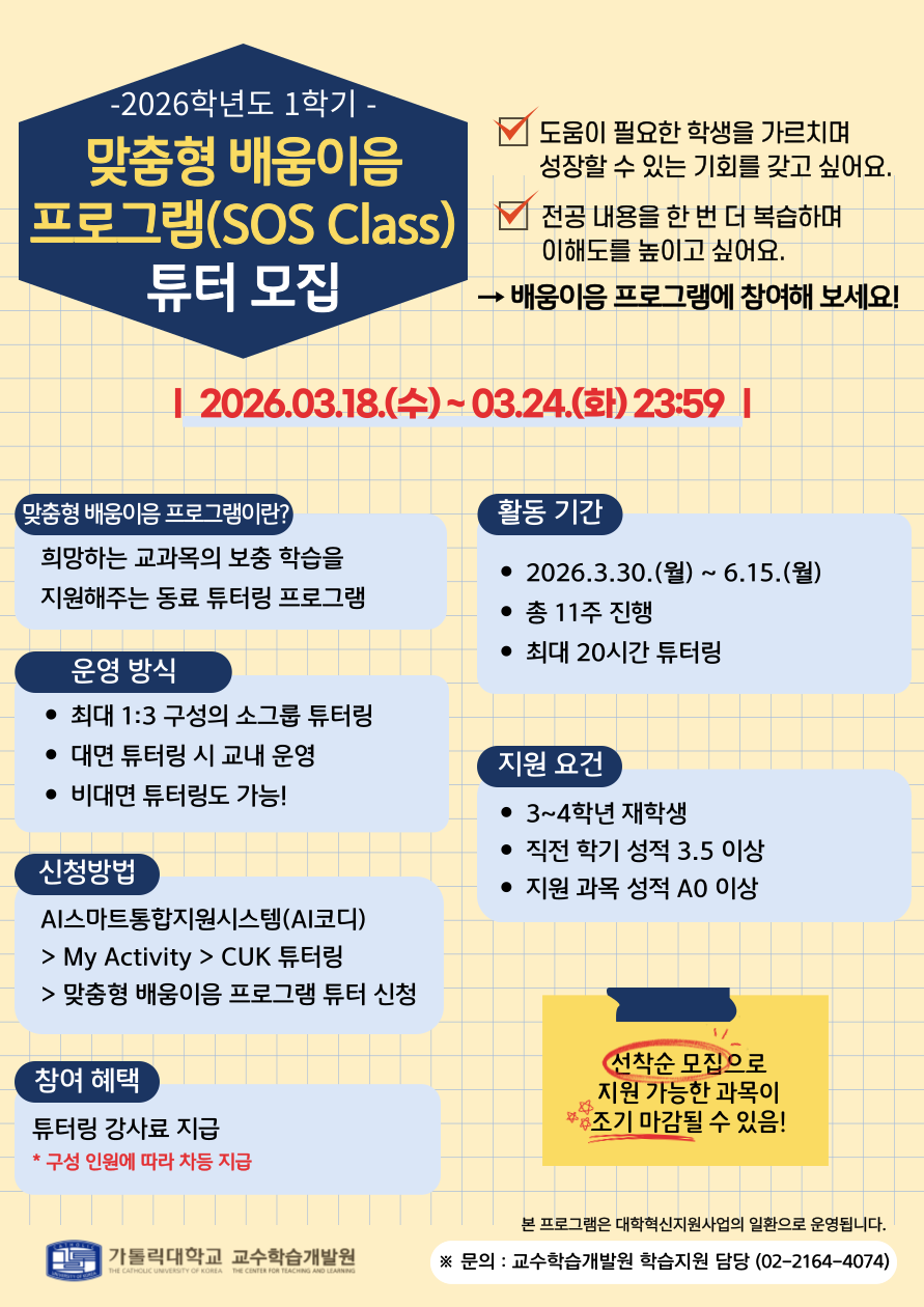 [교수학습개발원] 2026학년도 1학기 맞춤형 배움이음 프로그램(SOS Class) 튜터 모집 안내